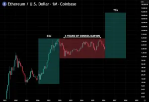 The monthly chart presents a clear consolidation zone. Price has moved between roughly $1,000 and $4,000. This range has lasted nearly four years since the 2021 peak.