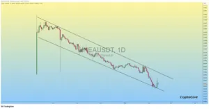 The daily chart shows LINEA price trading inside a defined descending channel. Lower highs and lower lows shaped this corrective structure for months. Both channel boundaries were respected with notable technical precision.