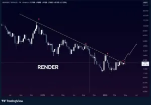 - Render holds $1.49 support as falling wedge tightens, signaling potential reversal structure.
