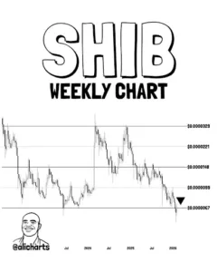 The weekly chart shows SHIB in a sustained downtrend since 2024. Price peaked near $0.0000329 before forming consistent lower highs and lower lows. That structure continues to define the broader trajectory.