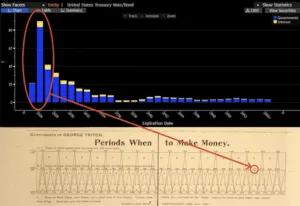 The chart shared in recent market discussions shows a sharp rise in Treasury maturities around 2026. Blue bars represent principal rollovers, while interest obligations appear layered above them. This visual framing has circulated widely on social platforms.